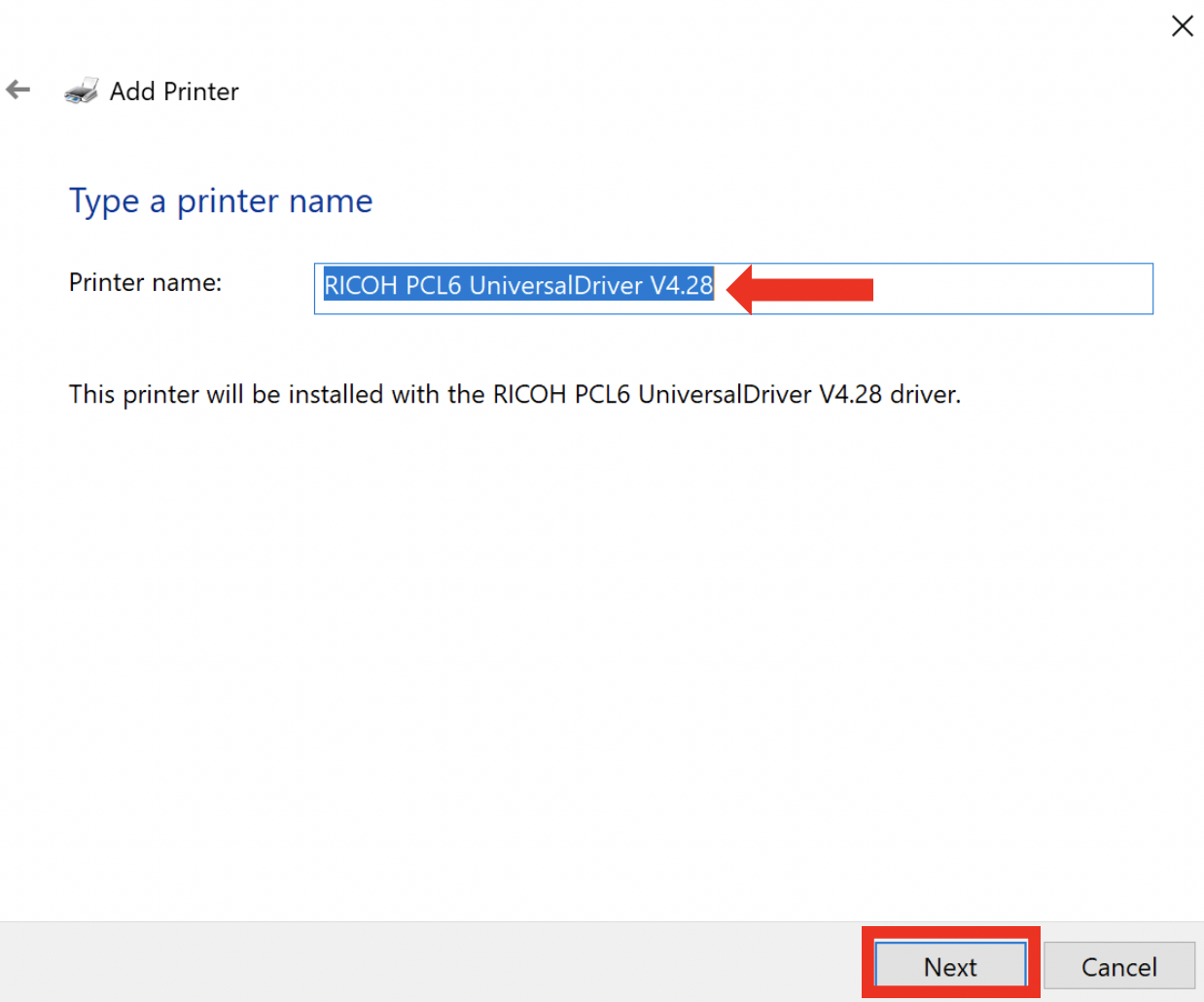Select the RICOH PCL6 UniviersalDriver V4.29 and click Next .